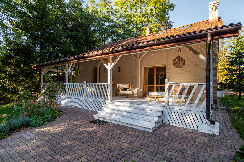 Dworek wita szerokimi schodami i otaczającą zielenią.