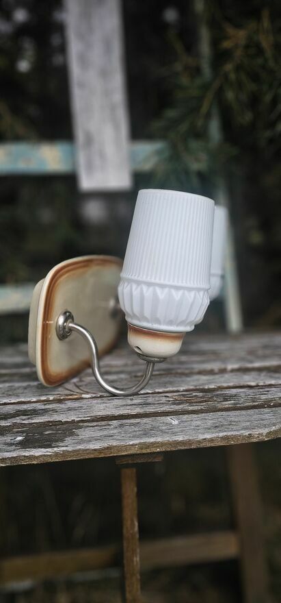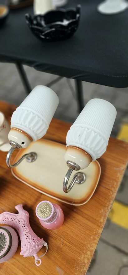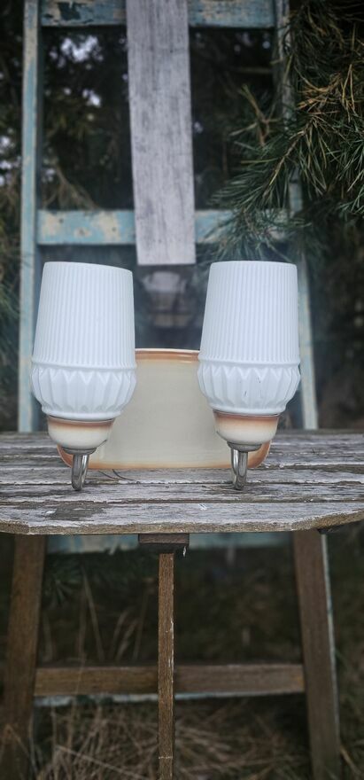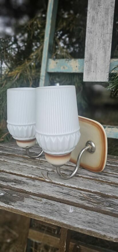 Kinkiet podwójny Spódzielni "Promień" Wieliczka. Elementy ceramiczne wykonane przez Mirostowickie Zaklady Ceramiczne.Wymiary podstawy: