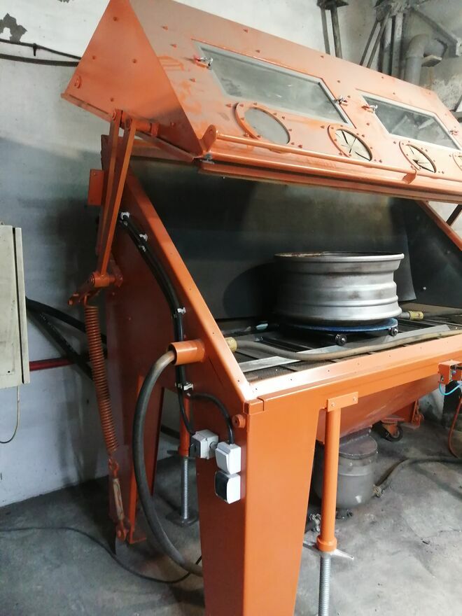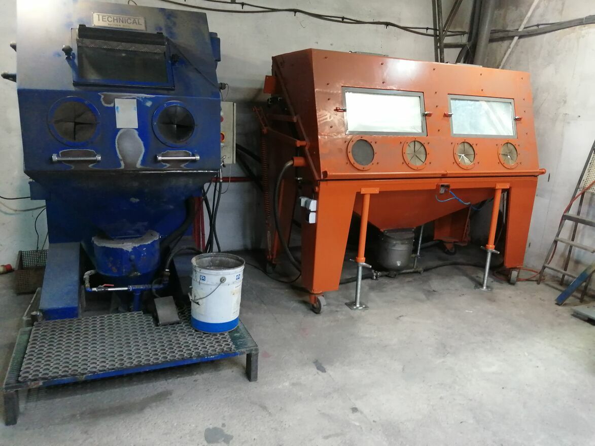 Sprzedam kpl. do obróbki strumieniowo ściernej wraz ze sprężarką śrubową.Dwie komory śrutownicze jedna OPI-700 Technikal Nowa Sól, druga pomarańczowa wykonana we własnym zakresie 200x80x80 cm.