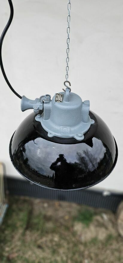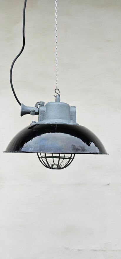 Czechosłowacja lata 60-te. Lampa przemysłowa wisząca typ 14301 A wyprodukowana przez Elektrosvit.Posiada czarny klosz emaliowany, białe wnętrze emaliowane, żeliwny korpus, przezroczystą szklaną pokrywę i żelazną kratkę.