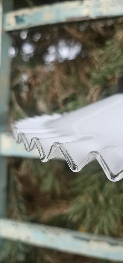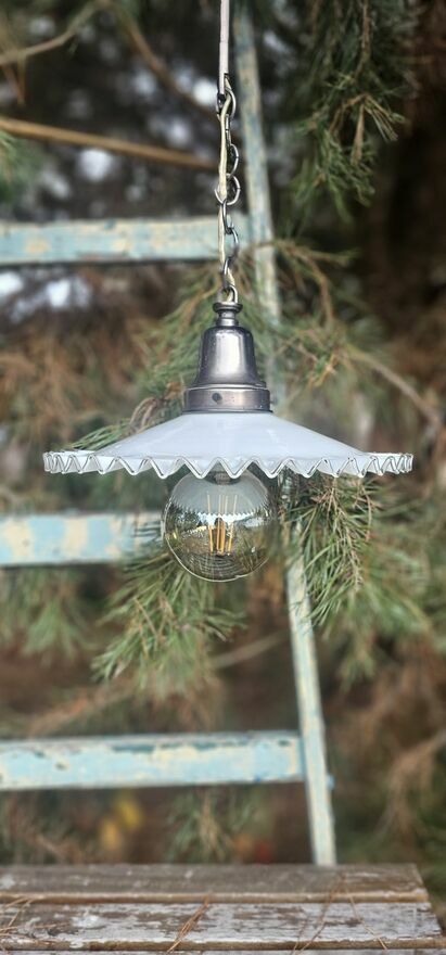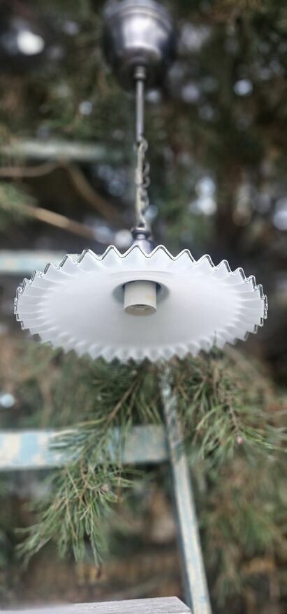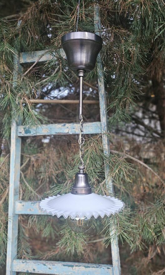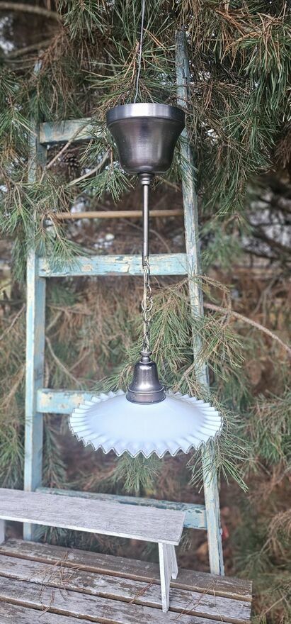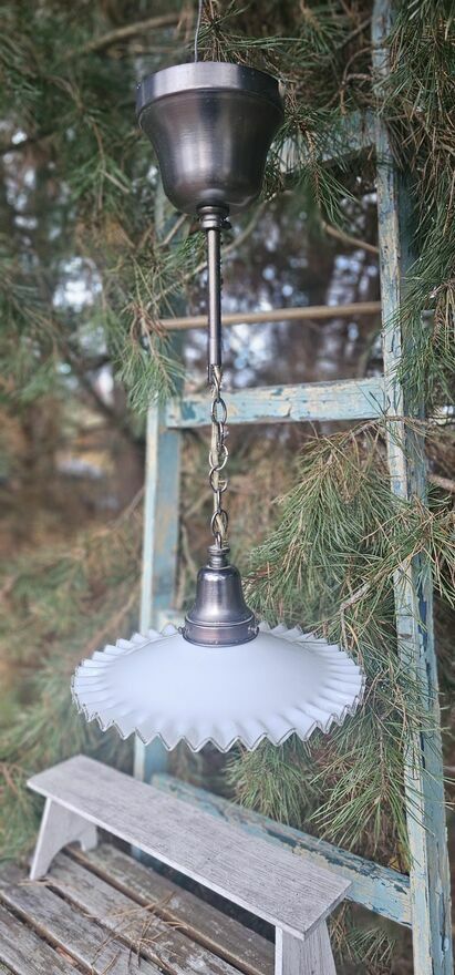Elegancka lampa wisząca o pięknym, szklanym kloszu. Zwis lampy metalowy stylizowany.Średnica klosza 28 cm