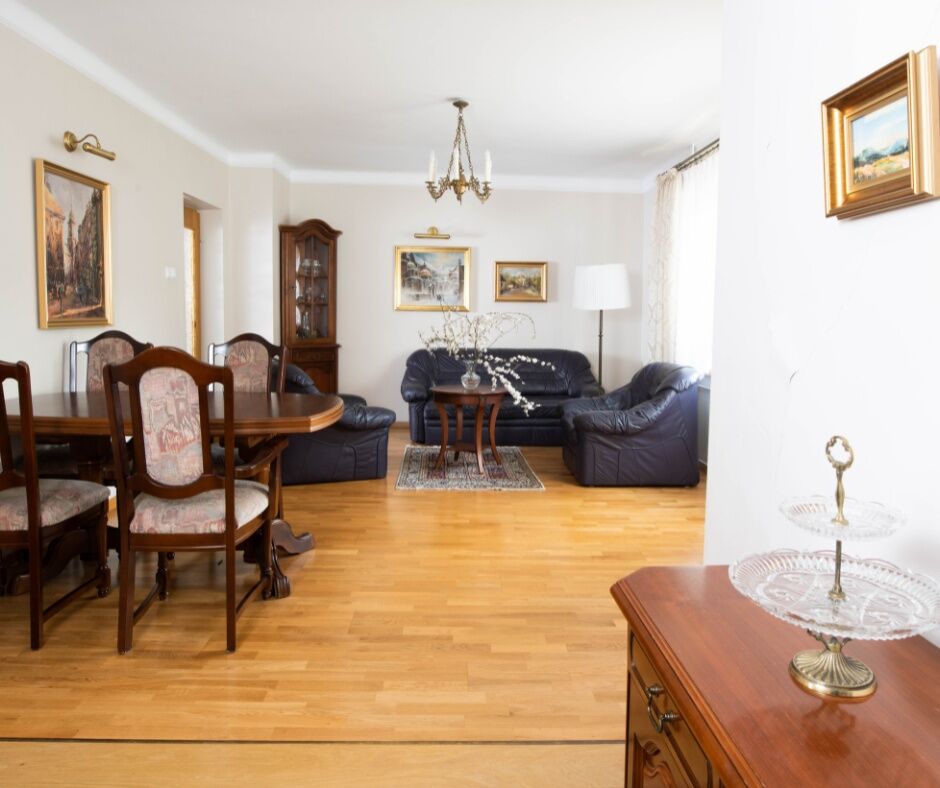 130m² składa się z dużego salonu, jasnej kuchni otwartej na oszklony pokój kawowy, 3 sypialni, gabinetu, 2 łazienek (w jednej wanna w drugiej prysznic), 2 przedpokoi oraz pokoju bilardowego (nie wliczony do metrażu).